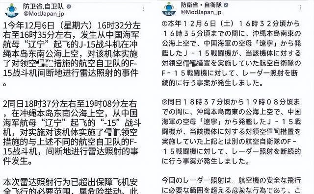 日本防卫省第一时间监测到这个动向,他们的统合幕僚监部公布了辽宁舰编队的照片和航迹图。照片显示辽宁舰在海面上航行,伴随舰艇紧随其后。 辽宁舰编队在穿越海峡后,进入冲绳东南的公海区域,开始舰载机作业。歼-15战斗机多次起飞,进行常规训练。日本航空自卫队为此出动F-15战斗机进行监视,但事情没那么简单,日本声称在下午4点32分到35分之间,一架从辽宁舰起飞的歼-15对他们的F-15实施了间断性雷达照射。 晚上6点37分左右,又发生了一次,持续约31分钟。日本防卫大臣小泉进次郎在记者会上表示,这种行为超出安全范畴,非常危险,已通过外交渠道向中方提出强烈抗议。