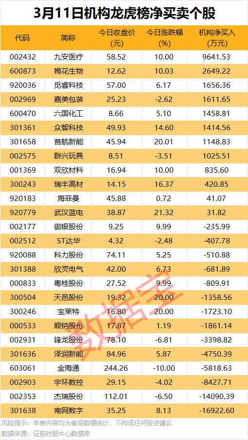 今日龙虎榜中,机构净买入个股有12只,机构净卖出的个股为14只。8股获机构净买入金额均超1000万元,九安医疗获机构净买入9641.53万元,居首;其次是梅花生物、觅睿科技、嘉美包装,机构净买入金额均超1000万元。